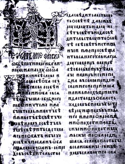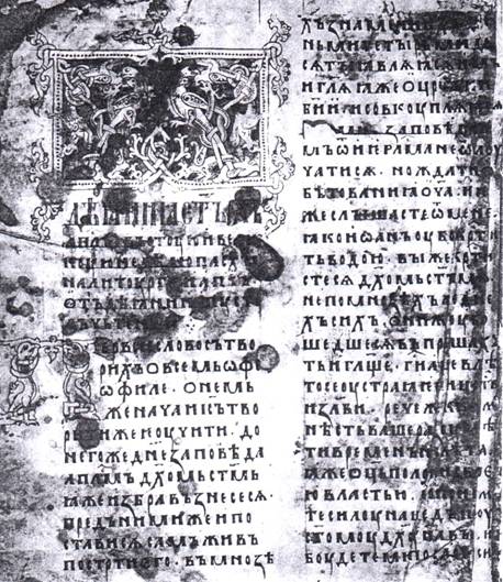 Заимствованный из Византии приём выделения начальных букв особо важных текстовых фрагментов претерпел у южных славян существенные изменения. Славянская манера рисования инициалов и заставок получила название тератологический стиль[13]. Изначально сложившийся у болгар в XII веке, он с начала XII века стал переходить в Россию. Существует два основных признака тератологии: