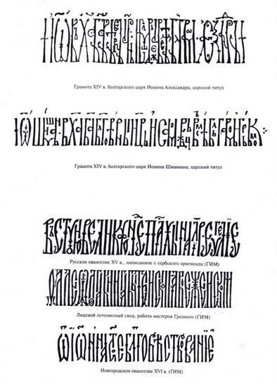 [6] «Появление полуустава, сначала в актах и грамотах, находилось в прямой связи с формированием единого Русского государства, сопровождавшимся резким увеличением и распространением деловой письменности». указанное сочинение стр. 86.