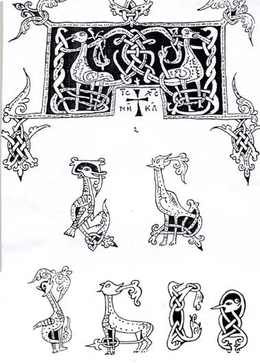 инициал представляет из себя птицу или зверя (четвероногое), выбрасывающих изо рта листву и опутанных плетением, исходящим из хвоста (или у птицы – также из крыла)»[14].