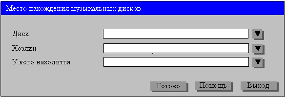 Организуйте программу так, чтобы при нажатии кнопки «▼» вызывался соответствующий список. Выбирайте значения только из списка. Если в списке отсутствует нужное значение (например, Вы описываете новый диск), сначала введите его описание в список и присвойте ему уникальный код. Только затем, выбрав название из списка, используйте это значение.