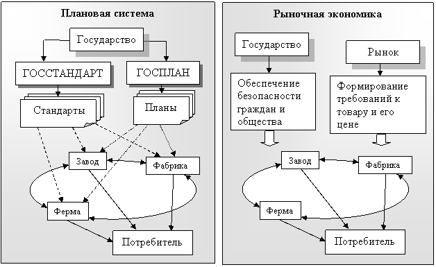Таким образом, в социалистической экономике стандарт отражал требования единого хозяина-государства. Устанавливая стандарты и осуществляя контроль за выполнениям их требований, государство управляло своей огромной фирмой.