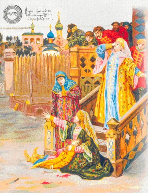 Самому правителю, дворянству такой выход из положения представлялся единственно возможным, трагических последствий его они предвидеть не могли. 90-е годы были для Бориса Годунова не только временем установления в стране новых порядков, но и порой прямой борьбы за царский венец. «Вчерашний раб, татарин, зять Малюты» (так охарактеризован он в пушкинской трагедии, а впрочем не был он ни рабом - происходил из костромских бояр, ни татарином) возжелал «шапку Мономаха». Прямую дорогу к трону Борису открыла гибель в Угличе царевича Дмитрия, последнего сына Ивана Грозного. Сразу по смерти Иоанна малолетний царевич, мать его царица Мария Нагая и ее родные были высланы из столицы в Углич, дабы своим присутствием в Кремле они не осложняли и без того смутную обстановку в Москве. Смерть царевича, случайно во время припадка эпилепсии, которой он действительно страдал, упавшего на нож, угодивший ему прямо в сонную артерию, несправедливо числится многими историками и писателями за Годуновым.