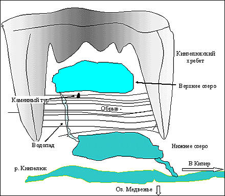 Прошло столько лет, но до сих пор свежо чувство обалдения, когда за поворотом долины открылось это чудо природы. Два каменистых отрога Кинзелюкского хребта (слева от реки) соединены подковообразной перемычкой. Ее высота, на глаз, четыреста - пятьсот метров. Ширина перемычки примерно такая же. И там, где эта перемычка примыкает слева к скальному отрогу, со всей огромной высоты, срывается вниз мощный водяной поток. Который в три гигантских прыжка достигает дна долины и питает Нижнее Кинзелюкское озеро, соединенное с Кинзелюком спокойной недлинной протокой.