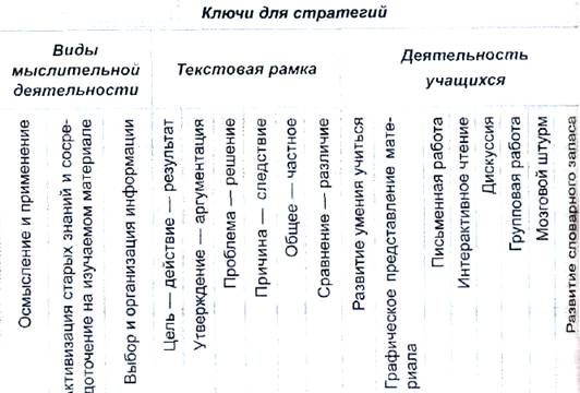 Описаний интерактивных стратегий можно найти много, но к ним следует давать некоторые ключи, которые помогут в дальнейшем произвести выбор нужной для работы формы занятия. Такие ключи можно давать в свернутом виде как небольшую таблицу. В ней указывают, для какого вида мыслительной деятельности предназначена данная стратегия, для какого текста она подходит и какие виды общеучебной деятельности она охватывает. Для начала приведем обобщенную таблицу, в которой есть все или почти все, что может быть.