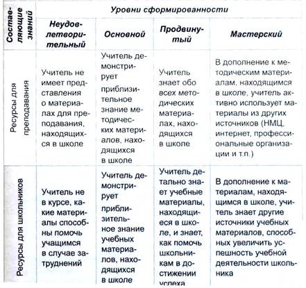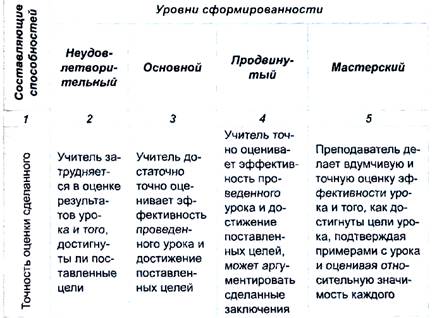 Для каждого отдельного компонента существует сетка анализа. В зависимости от содержания и характера деятельности учителя его компетентность в каждой сфере может быть отнесена к одному из 4 уровней: мастерский, продвинутый, основной и неудовлетворительный.
