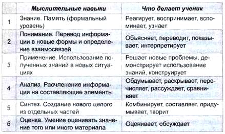 2. Осмысление. Чтение текста небольшими отрывками с обсуждением содержания каждого и прогнозом развития сюжета. Вопросы, задаваемые учителем во время остановок, должны охватывать Максимально возможное количество категорий учебных целей, связанных с развитием мыслительных навыков. Для этого удобно использовать таблицу, составленную с помощью работ Б. Блума и М. Кларина.
