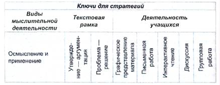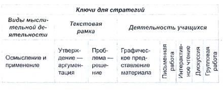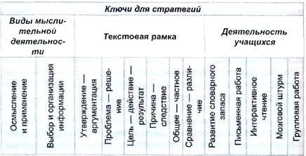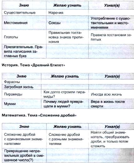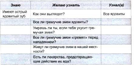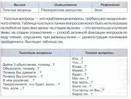 Общеучебные навыки. Наиболее важен в этой группе навык постановки вопросов. Роль вопросов в повседневной жизни велика. Задавая вопрос, мы в ответ получаем запрашиваемую нами информацию. Вопросом мы фиксируем «область незнаемого», направление, в котором будет идти изучение темы. Не случайно умению задавать вопросы нужно учить. Для выработки этого навыка могут использоваться И1Вестные многим учителям методические приемы (например, таблица «Толстый и тонкий вопрос», в левую графу которой записываются вопросы, требующие развернутых ответов, а в правую — вопросы с Однозначными ответами «да» или «нет»). Могут использоваться так же приемы и стратегии, разработанные непосредственно авторами Технологии и их последователями. Американская преподавательница Донна Огл разработала стратегию работы с информативным текстом, близкую той, которая была рассмотрена на примере урока по теме «Глагол», отдельным блоком в ней выделила работу с вопросами. Суть стратегии состоит в том, что в течение урока ученики работают с таблицей, графы которой названы «Знаю», «Хочу узнать», «Узнал». На стадии вызова школьники индивидуально, в парах и коллективно работают с первыми двумя графами. Большое внимание уделяется графе «Хочу узнать», именно с ее помощью формируется запрос на получение информации, возникает мотивация.