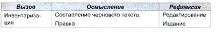 Главные задачи стадии рефлексии заключаются в том, чтобы исправить предшествующие представления, собранные на стадии вы зова, «присвоить» новую информацию и определить дальнейшие перспективы в изучении темы. Для реализации первой задачи обращаем внимание на записанные на доске и в тетрадях предположения, сверяем их с тем, что представлено в тексте, ложные предположения убираем (стираем с доски, зачеркиваем в тетрадях). В этой работе нам поможет значок «минус», которым мы пользовались при чтении текста. Например, очень часто школьники выдвигают тезис о том, что глаголы склоняются, т. е. изменяются по числам и падежам, тогда как глаголы в настоящем и будущем времени спрягаются, т. е. изменяются по лицам и числам. Информацию о мнимом склонении глагола ученик пометит в тексте знаком «минус», а из своего первичного списка вычеркнет. Так произойдет отказ от ложных предположений. Любой урок важен для учителя количеством и качеством усвоенной учеником информации. «Присвоить», а значит, понять материал можно с помощью перевода информации, заключенной в тексте, на свой язык. Для этого используем различные задания, требующие «переформулировки» идей текста. Например, логичным продолжением предыдущих будет задание составить таблицу, в которой в краткой форме должна быть отражена помеченная значками информация (в таблице — четыре графы, соответствующие названным маркировочным значкам). Заполняя таблицу, ученик должен выделить главное, перевести книжный язык учебника на свой, понятный ему, и в двух-трех словах сформулировать мысль.