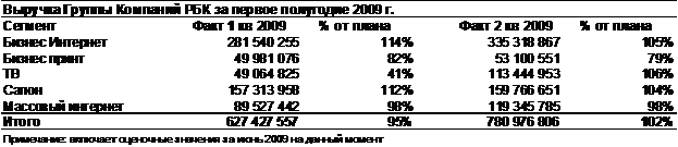 - компаний, осуществляющих деятельность в деловом сегменте Интернета, на которые приходится 53% прогнозируемой выручки 2009 года («РосБизнесКонсалтинг», . ру», «ИПК Медиа Продакшн»); компаний, которые издают газету «РБК Daily» и журнал «РБК», и на которые приходится 11% прогнозируемой выручки 2009 года («СМТП Пресс», ); компании, контролирующей телевизионную деятельность РБК, и на которую приходится 19% прогнозируемой выручки 2009 года («РБК-ТВ»); 80% акций EDI-S Press Limited (владельца ИД «Салон-Пресс»). Компания планирует продать активы ИД «Салон-Пресс» в 2009 году, чтобы покрыть свои потребности в оборотном капитале; всех рекламных агентств, включая российские и зарубежные (Mohiville Corporation N. V., «Глобал Медиа Солюшенс», , «РБК-Реклама») другие существенные компании группы РБК: «РБК-Медиа», Наши Деньги», Pintoleza Holdings Ltd.