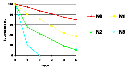 Рис. 1 Общая выживаемость больных в зависимости от лимфогенной распространённости процесса.