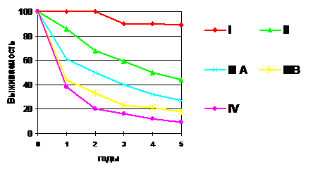 На основании вышеуказанной классификации были проанализированы результаты выживаемости в зависимости от стадии опухолевого процесса.