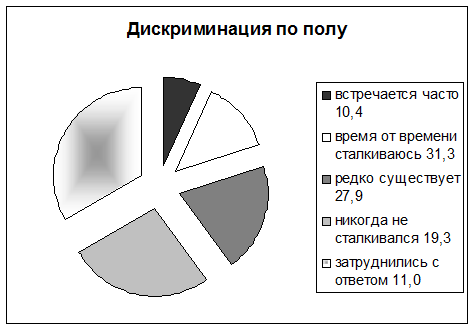 Дискриминацию при приеме на работу правильнее назвать скрытой, так как при отборе соискателей работодатель формально в качестве причины отказа указывает деловые качества, но в действительности отбор идет по половому или возрастному принципу. Таким образом, ст.3 Трудового кодекса РФ хотя и провозглашает запрещение дискриминации в сфере труда, но механизм реализации этого принципа отсутствует. Насколько серьезна эта проблема, мы видим из материала, предоставленного Клубом деловых и профессионально активных женщин Санкт-Петербурга, который осуществляют проект "Защита прав женщин на рынке труда". При официальном признании равенства мужчин и женщин, в России усиливаются дискриминационные тенденции в отношении женщин. Женщины постепенно вытесняются из престижных областей деятельности, понижается их статус и роль в обществе.