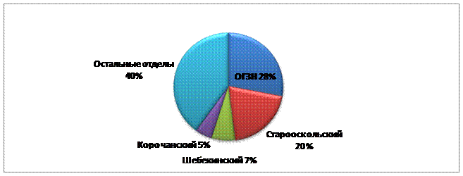 Отделом государственного земельного надзора наложено 243 тыс. рублей, что составляет 28% от общей суммы наложенных штрафов, Старооскольским отделом – 173 тыс. рублей (20%), Шебекинским отделом – 61 тыс. рублей (7%) (рис. 14).