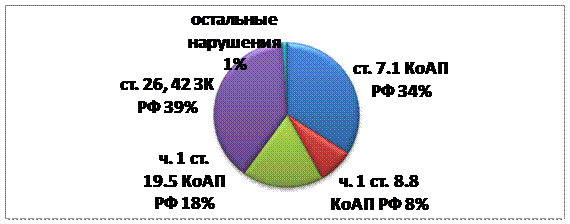 Характерными нарушениями земельного законодательства являются самовольное занятие земельных участков, использование их без правоустанавливающих документов и документов, разрешающих хозяйственную деятельность (35% от выявленных), не использование земель в соответствии с их целевым назначением (8 %), невыполнение предписаний госземинспектора по вопросам устранения нарушений земельного законодательства (18%), 39% - иные нарушения, предусмотренные статьями 26, 42 Земельного кодекса Российской Федерации (рис.16).