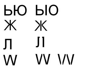 (ЬЮ-ЫО, Ж->|<, Л-JI, W-VV-\/\/)