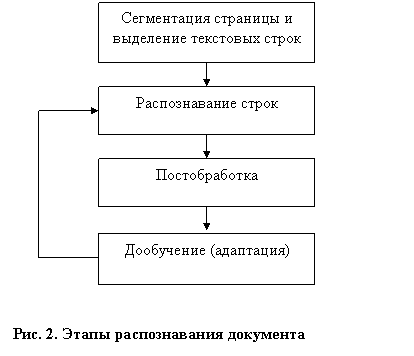 С нашей точки зрения, наиболее перспективным является применение моделей сегментируемых слов. Рассмотрим схему функционирования многопроходной OCR, представленную на рисунке. 2. Этап адаптации включает в себя как построение шрифтов, близких к используемым на странице образам, так и уточнение структуры документа, в частности, суженных алфавитов, относящихся к частям документа. Если в первом цикле распознавания строк сегментация проводится в достаточно широких предположениях, то на последующих этапах возможно использование множества ограничений, относящихся как к описаниям шрифтов, так и к модели слов, распознаваемых вторично. В частности, использование словарных механизмов позволяет формулировать следующую проблему относительно ненадежно распознанных слов: возможно ли распознать группу символов таким образом, чтобы получить в результате одно из слов заданной группы?