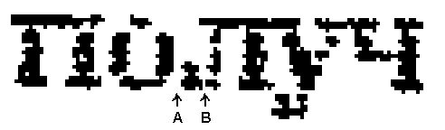 Рассмотрим пример, приведенный на рис. 4. Здесь подлежит сегментации фрагмент из трех склеившихся букв. Априори неизвестно, где проходит граница фрагмента: по сечению A или B. Проведение границы по сечению A означает, что компонента будет приклеена к левому символу, а по сечению B – что она будет отброшена. Чтобы предоставить выбор алгоритму, будем считать, что слово состоит из четырех символов, причем у первого (фиктивного) ширина может быть нулевой, а оценка зависит от его ширины: максимальна при нулевой ширине и убывает при возрастании ширины – и будем производить сегментацию не на три, а на четыре символа. Тогда все ненужные компоненты в начале фрагмента алгоритм поместит в фиктивный символ. По окончании сегментации мы его отбросим, а оставшиеся три символа будут представлять собой распознанное слово.
