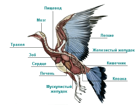 Пищевод птиц довольно растяжим, в особенности у заглатывающих крупную добычу видов (пеликаны, чайки, цапли, бакланы); характерно и часто встречающееся образование, так называемый зоб — богатое железами расширение пищевода. У тех птиц, которые сразу поглощают большое количество пищи, но подолгу иногда голодают, зоб, служит резервуаром для пищи, постепенно поступающей в желудок. У других, например у куриных, попугаев, уже в зобе начинается предварительная обработка пищи. У хищников в зобе накопляются непереваренные части пищу — кости, шерсть, перья и т. п. Передний отдел желудка птиц — так называемый железистый желудок — выполняет функции химической обработки поступающей пищи, а задний — мускульный желудок — перерабатывает пищу механически. Задний (нижний) конец желудка отделяется от кишечника кольцеобразным мускулом-сжимателем (сфинктером), препятствующим, проникновению в тонкие кишки обломков костей и других твердых или острых частей пищи. У рыбоядных видов птиц (цапли, бакланы, поганки, пингвины) и у некоторых других в заднем конце желудка имеется еще третий отдел — так называемый пилорический мешок; функция его — продление нахождения в желудке пищи для лучшей ее обработки. Железистый желудок более всего развит у птиц, сразу заглатывающих больше количество пищи (рыбоядных и хищных). Секрет пищеварительных желез у птиц действует весьма энергично: у марабу и многих хищных он полностью или в значительной мере растворяет кости, а у бакланов, цапель и уток — рыбью чешую, у сов и сорокопутов кости вовсе не перевариваются. Для всех видов птиц непереваримы хитин, кератин и клетчатка (последняя, быть может, у куриных, утиных и голубей частично усваивается вследствие деятельности кишечных бактерий). Мускульный желудок у некоторых птиц отличается сильным развитием мускулатуры, образующей к тому же сухожильные диски. Стенки желудка работают в этом случае как жернова и перетирают твердую и грубую пищу. Так устроен мускульный желудок у зерноядных и питающихся твердыми членистоногими моллюсками птиц (куриные, гусеобразные, страусы, журавли, многие воробьиные, многие голуби). У других птиц мускулатура в мускульном желудке развита незначительно, и в нем продолжается главным образом химическая обработка пищи ферментами, стекающими из железистого желудка. Так устроен мускульный желудок у мясоядных, рыбоядных и плодоядных птиц. У многих видов птиц трубчатые железы мускульного желудка выделяют секрет, образующий затем периодически сменяющуюся твердую кератиновую оболочку, так называемую кутикулу. Это также аппарат для перетирания пищи. Наконец, у многих птиц механическое воздействие мускульного желудка на пищу усиливается еще и тем, что они заглатывают песок, камешки или твердые семена растений. Переваренная пища поступает из желудка в кишечник, сначала в двенадцатиперстную кишку, затем в тонкие кишки. У большинства птиц имеются слепые кишки. Иногда они несут пищеварительные функции иногда являются вместе с тем и лимфатически-эпителиальным органом, иногда только последним; у некоторых видов слепые кишки рудиментарны или даже вовсе отсутствуют. Наибольшего развития достигают они у растительноядных птиц (впрочем, бывают и, исключения). Прямая кишка у птиц служит для скопления непереваренных остатков пищи; конец ее переходит в 
