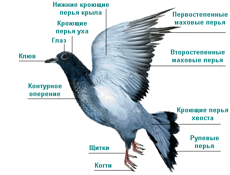 Контурные перья имеют различные размеры и форму. Разные группы их, носящие разные названия, несут различные функции. Среди них следует особо выделять первостепенные и второстепенные маховые перья. Первые, числом обычно 9 или 10, прикрепляются к тыльной стороне кисти, они жестче всех остальных перьев и во время полета создают тягу (в меньшей степени подъемную силу), опахала их обычно несимметричны. Второстепенные маховые крепятся к предплечью (точнее говоря, к локтевой кости). Число их изменчиво и колеблется от 6 (у колибри) до 37—38 (у некоторых трубконосых). Они составляют несущую поверхность крыла. Хвост образован рулевыми перьями (число их колеблется от 8 до 28). Остальные кроющие перья имеют специальные названия по нахождению их на теле: верхние кроющие и нижние кроющие хвоста, большие, средние, малые кроющие крыла и т. д. Пух отличается от контурного пера тем, что стержень его мягкий, опахала тоже мягкие и бородки их не сцеплены между собой. Растет пух или только на птерилиях, или на аптериях, у некоторых групп птиц — по всему телу. Пух служит для сохранения тепла. В строении птицы с точки зрения приспособлений к определенным способам передвижения обращают на себя внимание следующие особенности. В скелете, отличающемся прочностью и легкостью, передние конечности совсем освобождены от поддержания тела при ходьбе, стоянии, сидении. Их функция в основном сводится к передвижению по воздуху, т. е. полету, а у некоторых водных форм (пингвины) — к передвижению в воде. В связи с этим передние конечности не несут хватательных функций (хотя у птенцов гоацина, у которых к тому же пальцы некоторое время остаются свободными, передняя конечность служит для лазания по ветвям). Это, в свою очередь, вызвало изменения в устройстве скелета головы и шеи. Хватательные функции выполняет клюв. С этим связывается значительная подвижность затылочного сочленения, сильное развитие вращающих голову мускулов и перенесение центра тяжести головы назад. Шейный отдел позвоночника у птиц очень подвижен, а грудная клетка как бы отнесена назад. Подвижность шейного отдела позвоночника выражается и в широких возможностях сгибаний (как боковых, так и сагиттальных), и в возможности вращения шеи, обычно до 180°, у сов до 270°.
