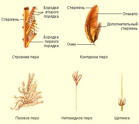 Строение контурного пера таково. Имеется плотный и упругий стержень, вокруг которого, обычно симметрично, расположено опахало, образующее плотную, непроницаемую для воздуха пластинку. Часть стержня, непосредственно выходящая из кожи и не несущая опахала, называется очином, остальная его часть носит название ствола. Часто перо имеет еще и так называемый побочный ствол, имеющий вид тонкого и мягкого стержня с пуховидными бородками и в редких случаях (например, у эму и казуаров) достигающий большого развития.