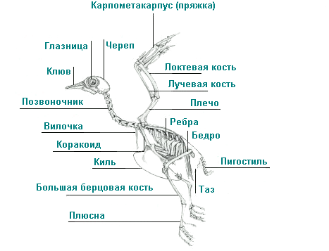 Скелет туловища, который должен служить прочной опорой при полете, малоподвижен. Позвоночник в грудном его отделе может сгибаться обычно лишь в боковом направлении (исключение — ныряющие формы и живущие в кустарниковых зарослях пастушковые). У многих форм ряд грудных позвонков срастается в одну так называемую спинную кость, ряд позвонков (поясничных, крестцовых, хвостовых, иногда и грудных) срастается вместе с тазовыми костями в сложный крестец. Свободные хвостовые позвоночные немногочисленны, а концевые хвостовые позвонки срастаются в служащую для поддержания рулевых перьев кость пигостиль. Лопатки плотно прилегают к ребрам, будучи соединены с ними системой связок и мускулов; ребра несут направленные назад крючковидные отростки, укрепляющие связь между ребрами по продольной оси тела. Сочленение костей плечевого пояса чрезвычайно прочно. Наконец, большие размеры грудины создают опору при полете для внутренних органов, а большой ее гребень (киль) служит местом прикрепления мощной мускулатуры, управляющей движением крыла. Туловищный скелет у птиц представляет собой крепкую и малоподвижную кость, напоминающую в какой-то мере остов самолета. Можно добавить, что мышцы прочно прирастают к ребрам, и движение последних при полете автоматически стимулирует работу дыхательного аппарата. В строении конечностей наиболее характерная черта — сращение ряда костных элементов. Сложный крестец и таз, образуемый слиянием ряда позвонков и тазовых костей, дают задним конечностям крепкую опору. Наиболее широкий и устойчивый таз свойствен наземным (бегающим) и лазающим видам, наиболее узкий — ныряющим. Бедро у птиц короткое, но мощное. В отличие от пресмыкающихся шейка бедра расположена к основной части под прямым углом. Подвижность бедра у птиц поэтому ограничена, но зато сочленение бедра с тазом чрезвычайно прочно. Малая берцовая кость редуцирована и в той или иной мере сливается с большой берцовой костью, к которой прирастает также и верхний (проксимальный) ряд предплюсневых (тарзальных) костей. Нижний (дистальный) ряд этих костей сливается с тремя плюсневыми костями в одну кость, так называемую цевку. У птиц имеется, таким образом, не голеностопное, а межплюсневое (интертарзальное) сочленение. Такое устройство ноги придает ей большую прочность и устойчивость. В частности, слияние плюсневых костей облегчает поддержание равновесия в момент, когда птица садится на землю или на ветку. Крепкая и длинная цевка облегчает отталкивание при взлете и делает птицу более устойчивой. Пальцы ног у птиц хорошо развиты и представляют собой самые различные типы адаптации к способу передвижения. У форм, живущих в болотистых местах и передвигающихся по мягкой поверхности, они очень длинны. У бегающих наземных форм они крепки, но довольно коротки, причем у наиболее специализированных для передвижения по земле групп (страусы и др.) наблюдается, как и у млекопитающих, редукция (уменьшение) числа пальцев. У древесных форм наблюдаются сложные приспособления к охвату ветвей и определенные корреляции (зависимости) между длиной пальцев и размерами сучков, на которые садятся те или иные виды. У водных форм развиваются плавательные перепонки.
