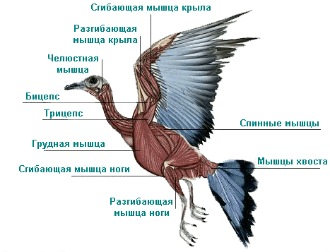 В связи с энергичным функционированием конечностей и слабой подвижностью туловища у птиц сильно развита мускулатура крыла и ног и относительно слабо развита мускулатура туловища. Шейная мускулатура очень сложная и функционально разнообразная, этим обеспечивается подвижность шеи. Большая грудная мышца, опускающая крыло, составляющая у хищных птиц примерно 1/14, у гуся 1/11 общего веса тела, как известно, расположена на груди, между плечевой костью и килем грудины. Впрочем, величина грудной мускулатуры не находится в прямой зависимости от размера крыла. Птицы с большой поверхностью крыла, в частности те, которые пользуются преимущественно парящим полетом, имеют сравнительно слаборазвитую мускулатуру крыла. Сильную мускулатуру имеют птицы с небольшой поверхностью крыла. Вообще же говоря, мускулатура птиц отличается большой плотностью, подвижностью, длинными сухожилиями. Из особенностей мускулатуры птиц следует еще упомянуть о своеобразном устройстве сухожилий мускула — глубокого сгибателя пальцев, создающем автоматический зажим ветви пальцами сидящей птицы. Сухожилие глубокого сгибателя пальцев имеет неровную поверхность, покрыто как бы насечками, которым соответствуют на широкой и свободной сумке сухожилия выступы, или ребрышки. У сидящей на дереве птицы под влиянием ее веса это зажимное приспособление сжимается, и пальцы фиксируются в согнутом положении. Это приспособление особенно развито у воробьиных, но имеется, по-видимому, у всех птиц (его нет только у бескилевых и пингвинов). Птицы передвигаются по самым различным субстратам; они, в общем, хорошо передвигаются по земле, лазают по деревьям, многие ныряют и плавают в воде, но наиболее характерным способом птичьего передвижения является все-таки полет. Нелетающих форм среди современных птиц немного. Некоторые из них (страусы, эму, казуары, нанду, киви, пингвины), возможно, никогда не летали, другие утратили способность к полету, несомненно, вторично.