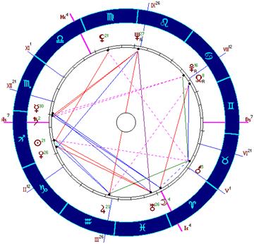 Отметим, что поражения от Плутона - Сатурна возникают и в двух случаях, приведенных ниже, но в этих случаях оппозиция Близнецов-Стрельца не сильно выражена.