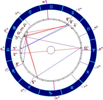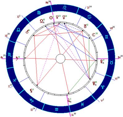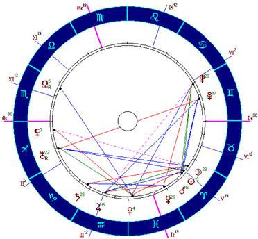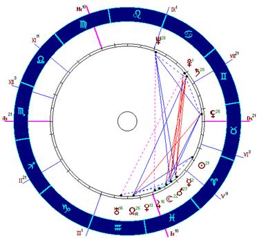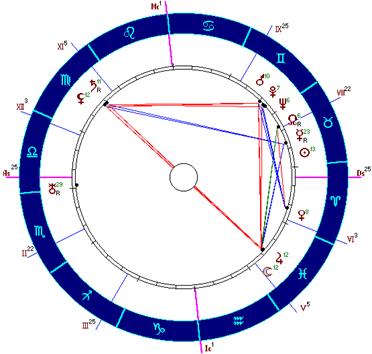 Имеется целый набор плохих конфигураций: Солнце-Сатурн, Луна-Уран, Луна-Нептун, Меркурий-Марс, Меркурий-Сатурн, Меркурий-Нептун. В дирекциях мы находим два мощных и существенных аспекта: Луна в соединении с Марсом (1 ) и Марс в квадратуре с Сатурном (1/4 ).