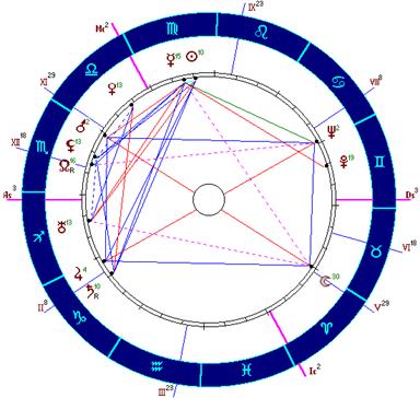 Вряд ли что-то можно можно сказать в психологическом отношении, т. к. ребенок достиг всего лишь двух с половиной лет, делая многое еще бессознательно. Имеется поражение в мутабельных знаках, хотя и не такое сильное, как в предыдущем случае. Включен элемент огня (Уран в Стрельце), имеется квадратура Луны и Сатурна, если не Марса-Сатурна. Нептун тоже поражен, вместе с Ураном и Луной он образует специфическую конфигурацию.