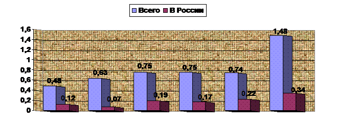 В том числе в СССР (России) | 0,8 | 2,7 | 4,2 | 22,5 | 31,6 | 44,8 |