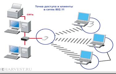 Все компьютеры оснащены беспроводными картами и подключаются к точке доступа. Которая, в свою очередь, имеет возможность подключения к проводной сети.
