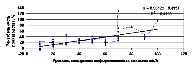Таким образом, влияние уровня внедрения информационных технологий на эффективность ведения хозяйственной деятельности предприятий достаточно очевидно и в рассмотренной нами совокупности предприятий эффекта убывающей отдачи не обнаружено. Для численного определения влияния фактора на результат прибегнем к корреляционно-регрессионному анализу.