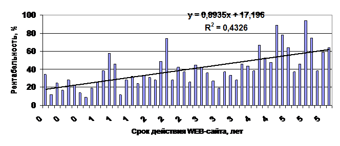 Таким образом, очевидно, что с каждым годом функционирования WEB-сайта рентабельность продаж компании растет на 0,8%. Высокий коэффициент детерминации позволяет говорить об этом достаточно уверенно.
