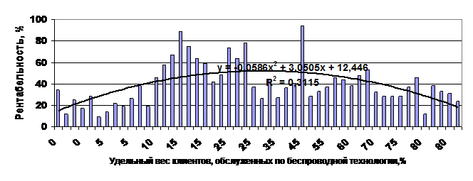 Таким образом, наиболее эффективно обслуживать по беспроводным технологиям только 30-35% клиентов. Снижение этого порога влечет к потере той категории клиентов, которая принадлежит к высокоинформатизированной части общества, и предпочитает использовать в работе новейшие технологии. При повышении удельного веса таких клиентов теряется консервативная часть целевой аудитории.