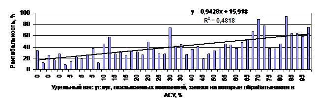 Изученные показатели имеют линейную зависимость, то есть максимизация удельного веса автоматизированной обработки информации влечет к росту эффективности функционирования компании.