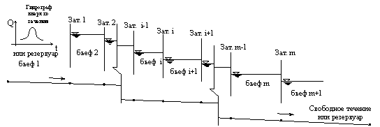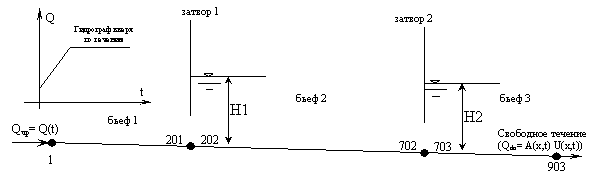 На рисунке 2 показана генеральная схема одного бьефированного канала с вертикальными затворами с электрическим приводом. Номер бьефов (m+1), а номер затворов (m).