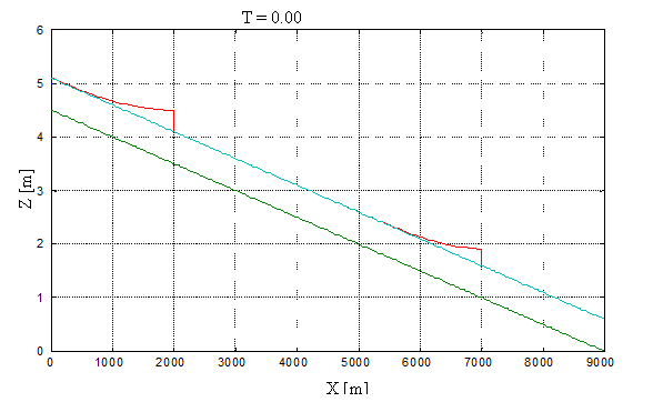 Физические параметры канала: длина канала – 9000 м (бьеф1 – 2000 м; бьеф2 – 5000 м; бьеф3 – 2000 м); ширина по дну – 2 м; продольный уклон дна канала – 0,0005; коэффициент заложения откоса – 1,5; коэффициент шероховатости по Мэнинга – 0,018; ширина затвора – 2 м. В канале нет боковых входов и выходов.