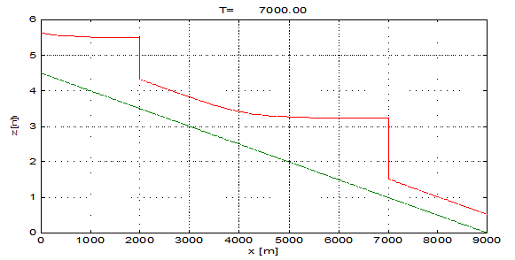 Уровень воды, скорость и расходы показаны в уточнёных узлах, вдоль канала сверху вниз по течению. Длина пространственного и временного шага должна быть обусловлена так, чтобы соблюдался критерий Куранта.