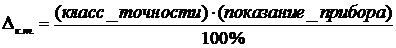 Для большинства электроизмерительных приборов допускаемая погрешность задается при помощи специального числа, называемого классом точности. Приборная погрешность, связанная с классом точности прибора называется погрешностью класса точности прибора