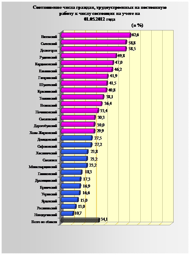 В среднем по области на постоянную работу трудоустроено 34,1% граждан от числа состоявших на учете. При этом более высокие показатели имеют центры занятости населения Вяземского и Сычевского районов, г. Десногорска, а также, Руднянского, Кардымовского, Ельнинского, Гагаринского, Шумячского, Краснинского, Темкинского, Велижского, Починковского, Смоленского, и Дорогобужского районов, где постоянное рабочее место с помощью службы занятости нашли свыше 30,0% граждан, состоявших у них на учете.
