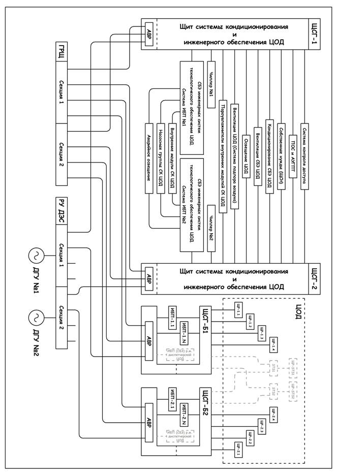 Для электроснабжения групп систем ИБП, систем инженерного обеспечения и прочих технологических потребителей ЦОД предусмотреть вводно-распределительные силовые щиты (ЩСГ). В щитах ЩСГ предусмотреть ввода 0,4кВ с каждой секции ГРЩ и ввод от распределительного(-ых) устройства(-в) аварийной дизельной электростанции (РУ ДЭС).
