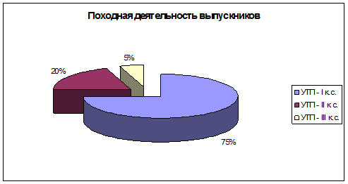 На сегодняшний день 20 из них продолжают инструкторскую деятельность, т. е. регулярно участвуют в соревнованиях, ходят в учебно-тренировочные походы (УТП) и являются квалифицированными инструкторами: УТП – I к. с. (юный инструктор) –15, УТП – II к. с. (инструктор проводник) – 4, УТП – III к. с. (инструктор спасатель) – 1.