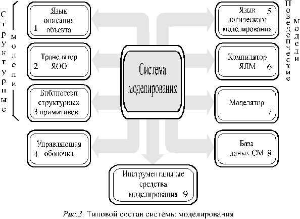 Типовой состав профессиональной системы моделирования (рис.3) включает графический или текстовый язык описания объекта (ЯОО), с помощью которого пользователь вводит в систему моделируемую схему. Для событийного моделирования описание объекта обычно представляется в табличной форме или автоматически преобразуется в неё из исходного графического представления (в так называемый связный список).