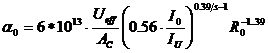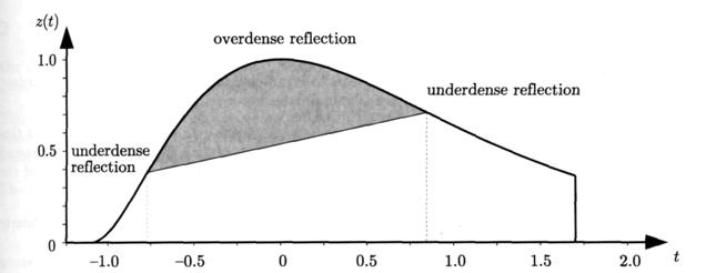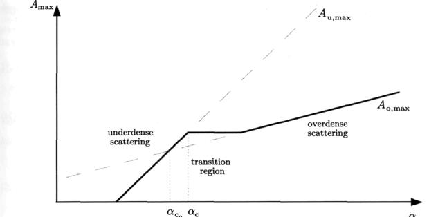 - логарифм амплитуды отраженного сигнала от недоуплотненного следа возрастает так же быстро, как и функция log α. Для переуплотненного эха крутизна возрастания. меньше. Нужно заметить, что для α>αc0, амплитуда эха для недоуплотненного следа должна бы быть больше чем амплитуда эха от переуплотненного метеорного следа. Однако, за счет начального радиуса и диффузии за время формирования следа между переуплотненными и недоуплотненными зонами существует область, где не применимы формулы для обоих типов следов – так называемая переходная область. Для нашей физической модели мы будем считать, что в этой области коэффициент отражения не меняется.