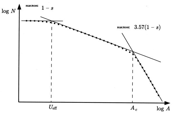 Интегральное распределение амплитуд метеорных радиоэха в двойном логарифмическом масштабе показано на рис.3. Минимальная регистрируемая электронная плотность