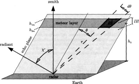 Все ионизированные следы метеоров данного метеорного потока параллельны. Следовательно, благодаря свойству зеркального отражения на метеорных следах, все отражающие точки метеоров от этого потока будут лежать в плоскости эха, нормальной к вектору скорости метеорных тел (или направлению на радиант) и проходящей через точку, где находится радар, как показано на рисунке 1. Конечно, отражающие точки метеора должны также располагаться в метеорном слое в атмосфере.