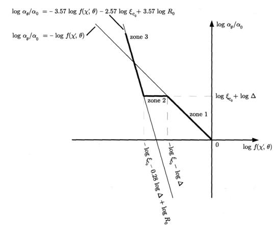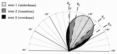 Чтобы учесть это, мы делим плоскость эха на три зоны, как показано на рисунке 2. В первой зоне, минимальная регистрируемая линейная электронная плотность αθ соответствует недоуплотненным метеорным следам, то есть, αθ <αc (αc приведено в формуле 27 на странице(?)), и большинство наблюдаемых метеоров будут недоуплотненными. Вторая зона имеет