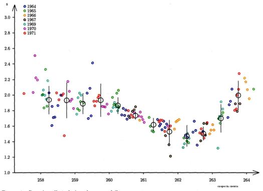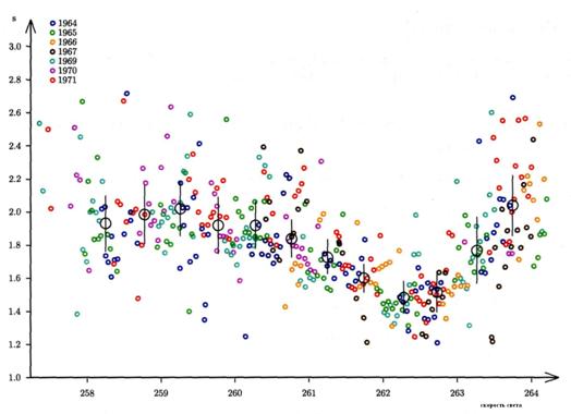 Рисунок 4 - Первичные (малые кружки) и усредненные (большие кружки) параметр s Geminids как функция долготы солнца