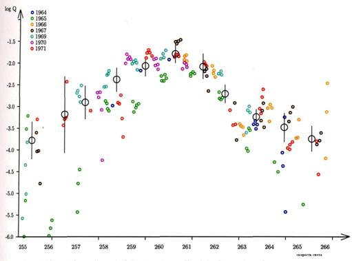 Рис. 5. Профиль логарифма потока плотности Geminids в 1971, как функция долготы солнца