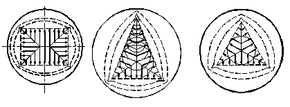 Кроме изменения размеров, при осадке искажается форма продольного и поперечного сечений. Причиной этого являются силы трения на контактных поверхностях заготовки, верхнего и нижнего бойков (рис. 5.4). Закон трения: поверхностное трение из-за шероховатости контактных поверхностей заготовки и бойка (ручья штампа) создает значительное сопротивление пластическому течению металла и приводит к образованию зон затрудненной деформации. Вредное влияние трения снижается за счет смазки, тщательной шлифовки, полировки и скругления контактной плоскости бойка (ручья штампа). Искажение формы подчиняется закону наименьшего сопротивления: пластическое течение металла всегда происходит в направлении наименьшего сопротивления. Направление течения металла, как следует из формулировки закона, совпадает с прямой перпендикулярной стороне поперечного сечения. Внешние точки круглого сечения равноудалены от его центра, линия наименьшего сопротивления совпадает с радиусом, поэтому силы трения по всем направлениям одинаковы, при осадке, круг лишь увеличивается в диаметре. Точки периметра некруглой формы (рис. 5.5) по-разному удалены от центра вписанной окружности, радиус которой перпендикулярен стороне поперечного сечения и указывает направление пластического течения металла. Скорость пластического течения металла на периферийных участках поперечного сечения разная (рис. 5.5), например, углы прямоугольника или треугольника деформируются менее интенсивно, хотя давление, создаваемое бойком, одинаково по всей плоскости контакта. Ближе к центру вписанной окружности, объемы металла в направлении наименьшего сопротивления больше, значит, больше сила деформирования и скорость пластического течения. Как видно из рисунка 5.5, при таком расположении и длине лучей течения металла, сечение должно принять прежнюю угловатую форму. Силы трения по всей плоскости различны, поэтому скорость пластического течения не соответствует длине луча, а стороны сечения выгибаются. Участки, деформирующиеся наиболее интенсивно, увлекают за собой менее поддатливые (углы сечения), поэтому, по мере увеличения степени (величины) осадки, силы трения постепенно уравниваются во всех направлениях, что позволяет получить круг из любой формы поперечного сечения. Если осаживать заготовку прямоугольного сечения, тогда, сначала образуется овальная форма, при увеличении деформации, силы трения выравниваются по всем направлениям – сечение стремится принять круглую форму. Для треугольника свойственно промежуточное образование граненой формы из трех дуг.